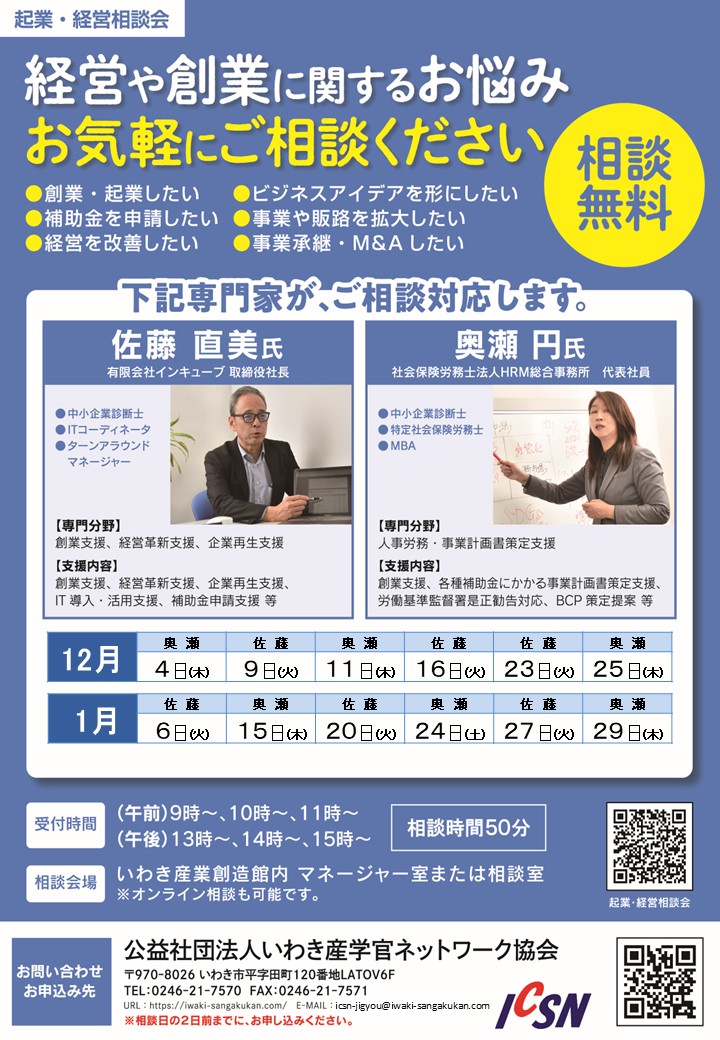 いわき市内での起業・創業(予定)される方を対象とした起業・創業に関する相談のほか、中小企業や自治体、支援機関の方々に対して、経営課題の解決に向けたアドバイスを行うための相談窓口も開設しております。